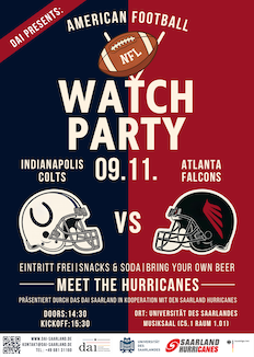 Am 9. November lädt das DAI Saarbrücken in Kooperation mit den Saarland Hurricanes zur NFL Watch Party in den Musiksaal der Universität des Saarlandes ein. Übertragen wird das Spiel der Indianapolis Colts gegen die Atlanta Falcons.